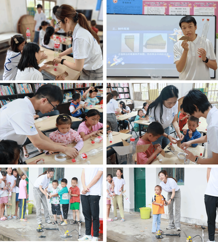 随后,实践队全体成员带领同学们亲手制作水火箭并发射。在实践队队员的指导下,孩子们应用日常生活中的材料,自己动手进行制作。在欢呼声中,孩子们满怀期待地放飞了承载梦想的水火箭。
