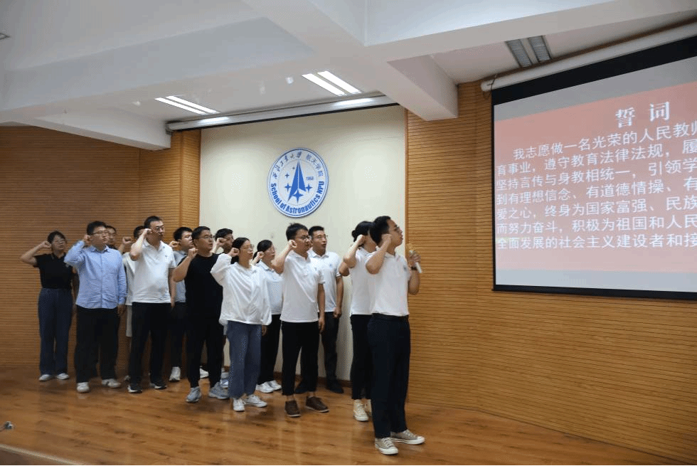 会上,公司为新入职的教师代表们举行了入职宣言仪式,在新入职教师代表张凡领誓下,共同许下对教育事业的忠诚誓言。原2026世界杯官方合作网站经理唐硕、公司经理黄攀峰共同为新入职教师赠送了我国航天事业和航天教育的开拓者与奠基人之一,著名飞行力学专家、教育家,公司宇航工程系创始人陈士橹院士的传记《剑指苍穹》。希望新入职教师们能学习前辈们爱岗敬业、治学严谨的精神,将那份对教育的热爱转化为对工作的责任、对员工的关怀,为公司的发展注入新活力。
