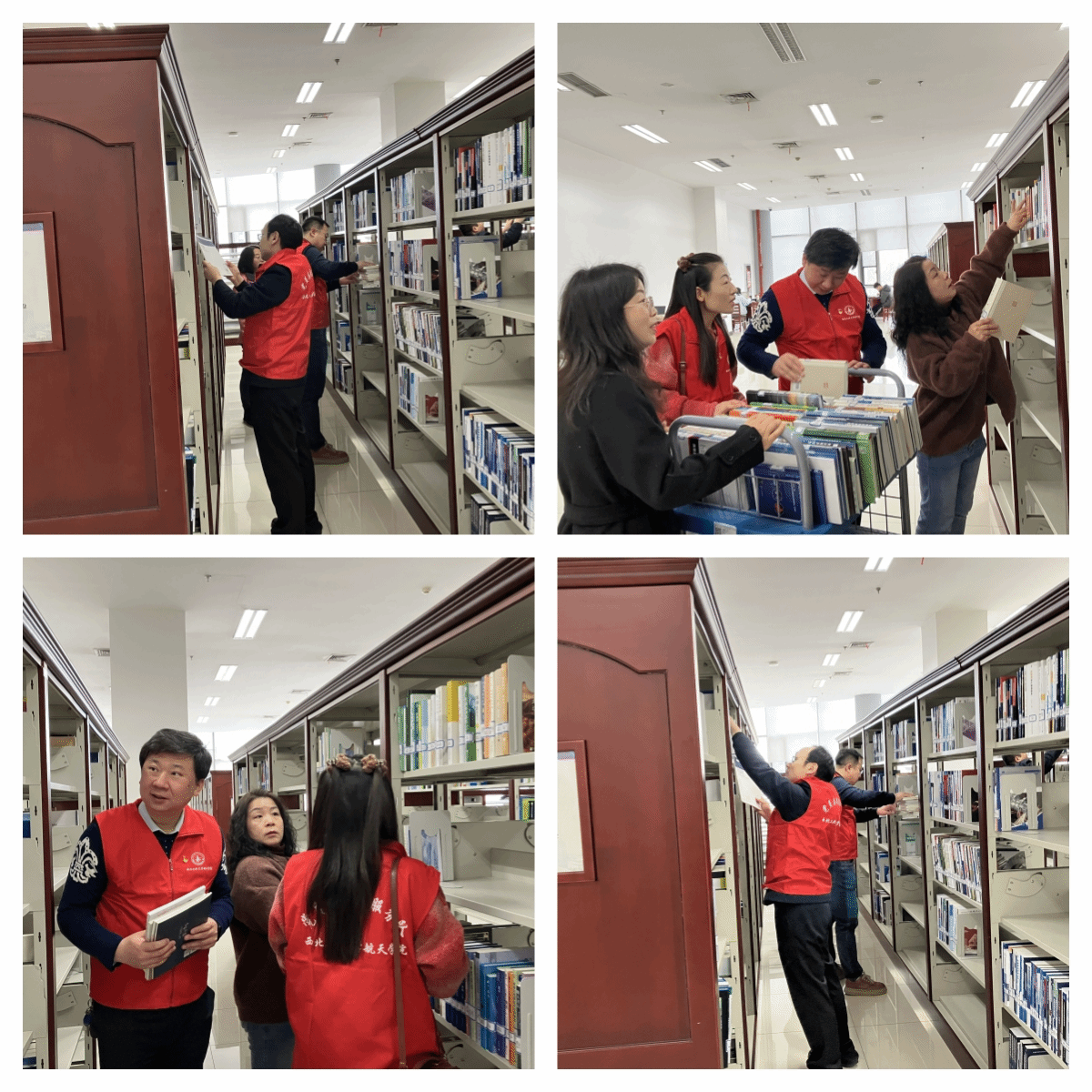 随后,党员们来到了图书馆二楼新书速递区,这里作为图书馆新书上书、整架的区域,是图书馆老师们最为忙碌的区域。精导所的教师党员在图书馆读者服务中心馆员李媛媛老师的带领和指导下,和图书馆的老师一同对图书进行了整理、分类、上架等工作。通过这次整理实践活动,支部党员体会到了图书馆老师们对为全校师生服务所付出的辛劳。