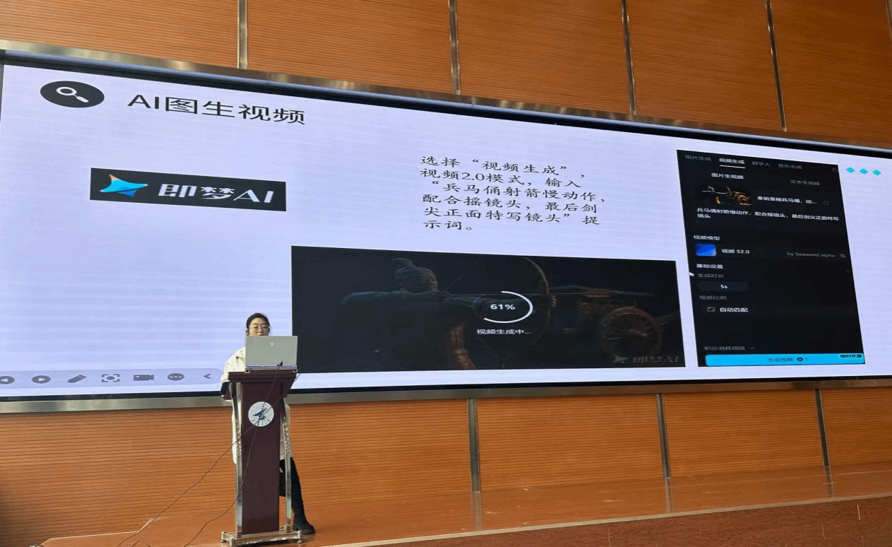 本次工作坊以“AI重构影视创作全链路”为主题,刘韬围绕智能技术赋能下的创作流程展开深度解析。在选题策划阶段,她提出“人、具、粮、法、环”五维选题模型,通过多维度分析助力创作者精准定位创意方向;在内容生产环节,现场演示了AI工具在故事梗概生成、专业分镜头脚本撰写等前策划阶段的高效应用,并重点展示了“文生图”技术实现视觉素材快速生成、“海绵音乐”平台定制化创作情绪配乐、“图生视频”技术转化动态影像等前沿实践。针对后期制作,刘韬分享了智能剪辑、自动化字幕生成、AI数字人配音等创新技术,特别传授“多镜头角色形象统一”“音频驱动视频生成”“首尾帧无缝衔接实现伪一镜到底效果”等实战经验。