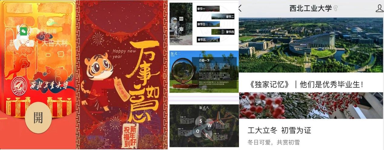 在任职党委宣传部融媒体办公室员工助管期间,余佳洁积极参与官方微信平台内容制作,出品数篇推文、西工大官方PPT模板、虎年微信红包定制封面等。发挥自身特长,为讲好工大故事尽一份绵薄之力;奉献自身热爱,在官微见证一批又一批工大学子从四面八方来,到五湖四海去。