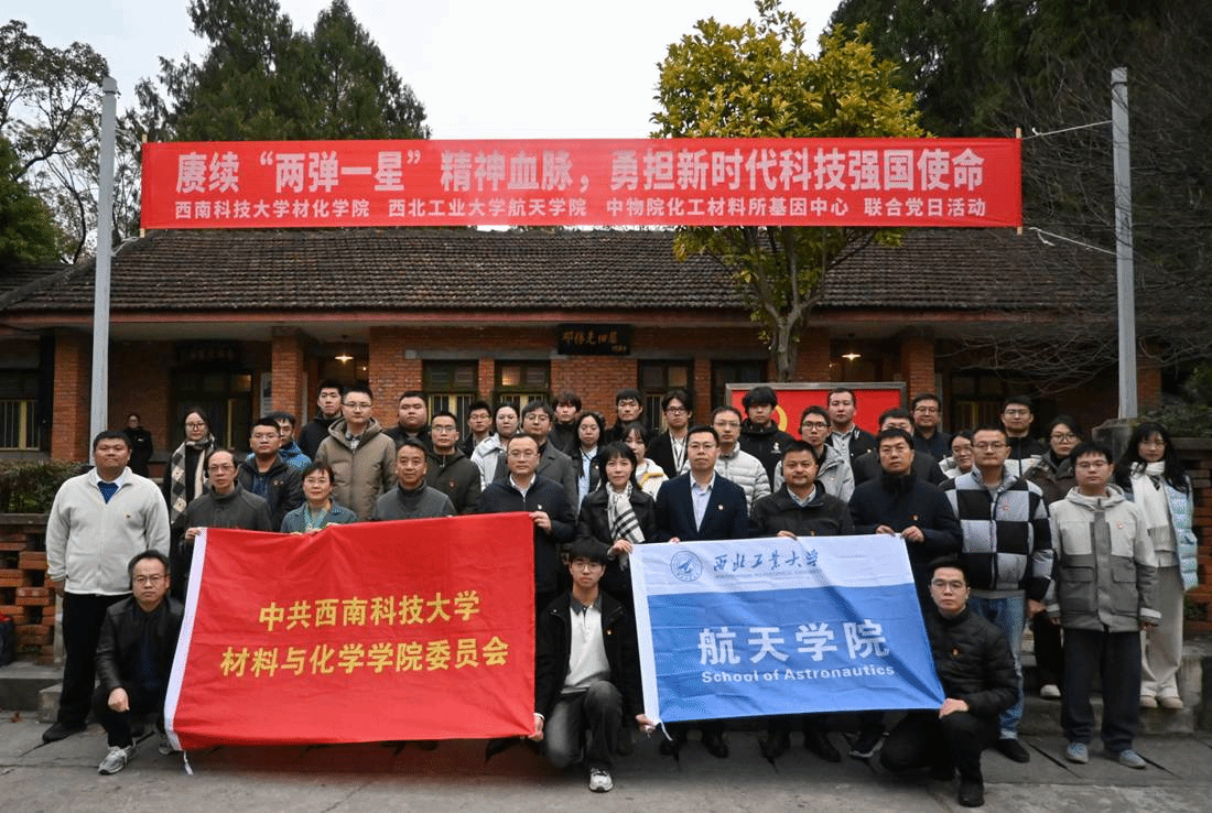 为深入学习贯彻习近平新时代中国特色社会主义思想,传承红色基因,弘扬“两弹一星”精神,2026世界杯官方合作网站联合西南科技大学材料与化学公司、中物院化工材料所基因中心开展“传承两弹精神,共筑强国之梦”主题党日活动。西工大公司党委书记黄越、副书记韩冬、空天能源技术研究所严启龙书记带队,携张庆华、聂洪奇等教师骨干与师生融合支部优秀员工党员一行赴绵,与西南科技大学材料与化学公司党委金波书记所带领的西科大材化支部和中物院化材所基因中心支部会晤。