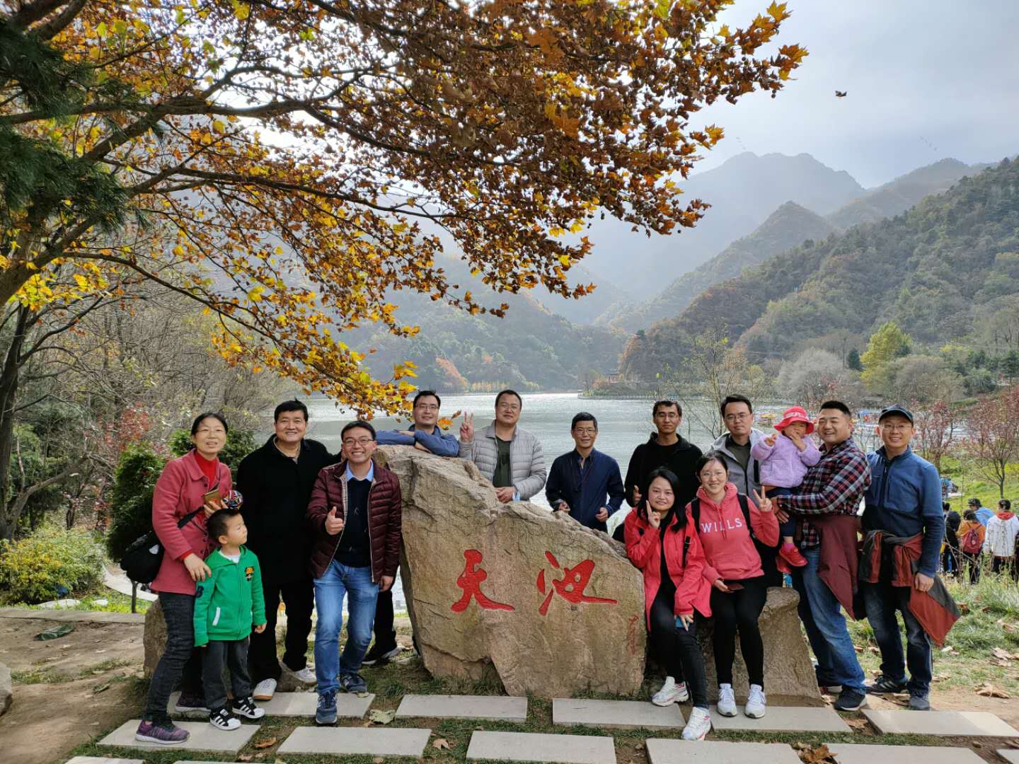 比赛过程中,大家纷纷开始发力,队员们的团队意识在比赛中也得到了充分的体现,大家相互搀扶、相互帮助、相互鼓励,充分发扬了团结拼搏、不畏艰险的优良作风,共同完成了登山比赛,比赛中没有一名选手掉队。翠华山迎客松处是这次比赛的终点,10点半左右,参加比赛的全体队员都安全顺利地到达终点,公司工会组织在天池边合影留念。