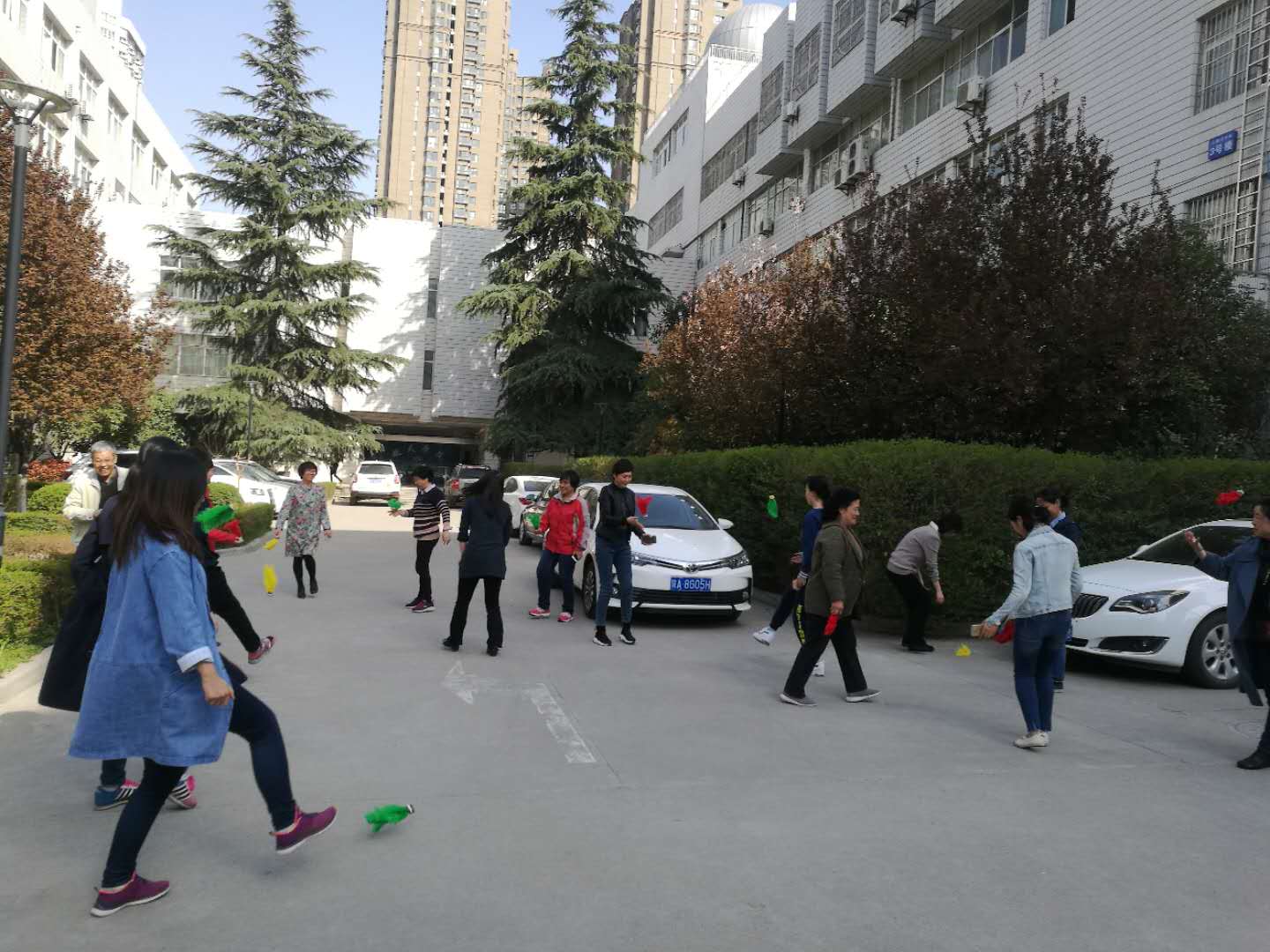 比赛还未开始,已有不少老师提前拿起毽子进行赛前热身。比赛前,队员们围着公司办公楼集体健步走一圈,大家放下手头工作,友好交流,其乐融融。热身健步走结束后,队员们投入了紧张的毽子单踢两分钟计时比赛。老师们一个个精神抖擞,做出了各种各样的动作,有的一直用一只脚踢,有的双脚交换着踢,抛毽、甩手、踢毽,眼睛追着毽子的起落,五彩的毽子被踢得上下翻飞迟迟不愿落地,整个比赛充满了奋力拼搏、激情欢乐的气氛。