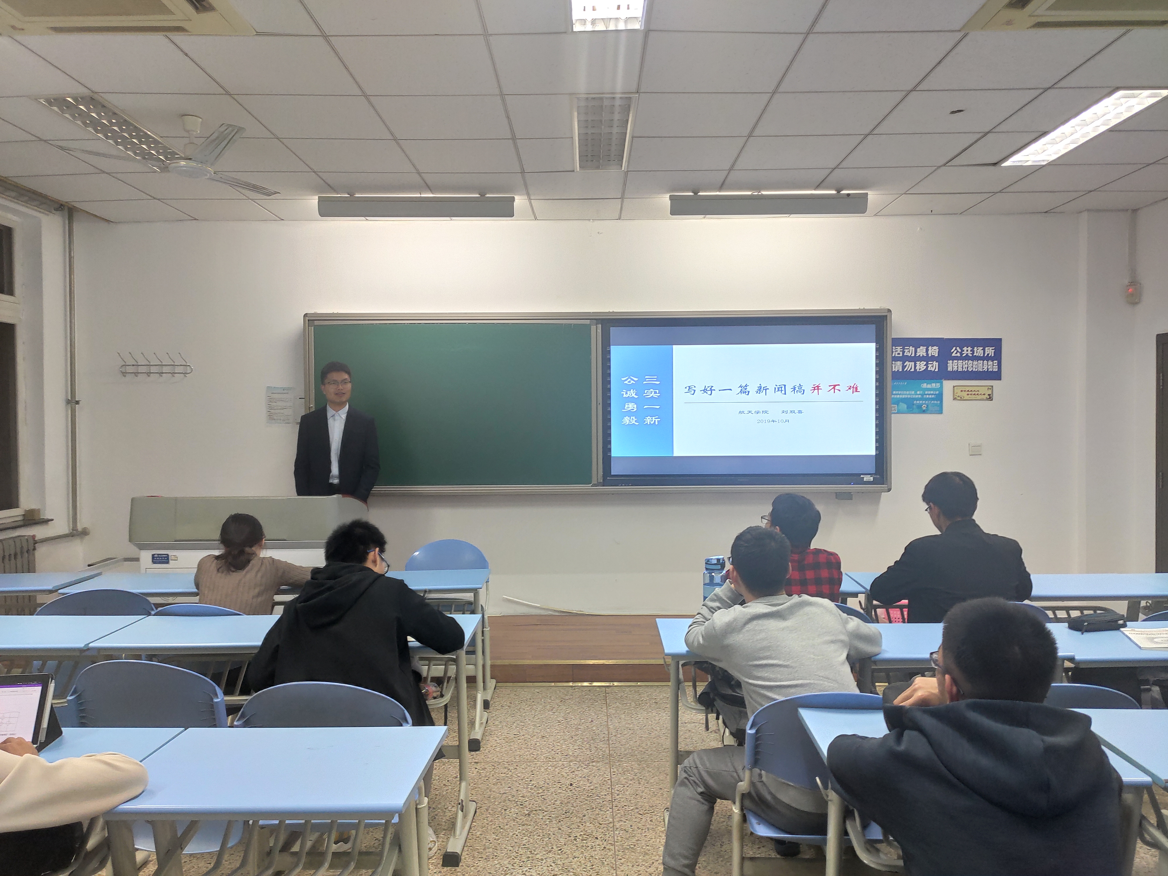 随后,刘双喜以“写好一篇新闻稿并不难”为题,强调了新闻宣传的意义所在。他以社团活动、翱翔名家讲堂、班级活动为例,示范如何撰写不同类型的新闻稿,并对“航小天”微信公众号的运营提出了具体要求与改进意见,希望大家能做出有特色、有深度、有广度、受欢迎的“航小天”新媒体宣传平台。