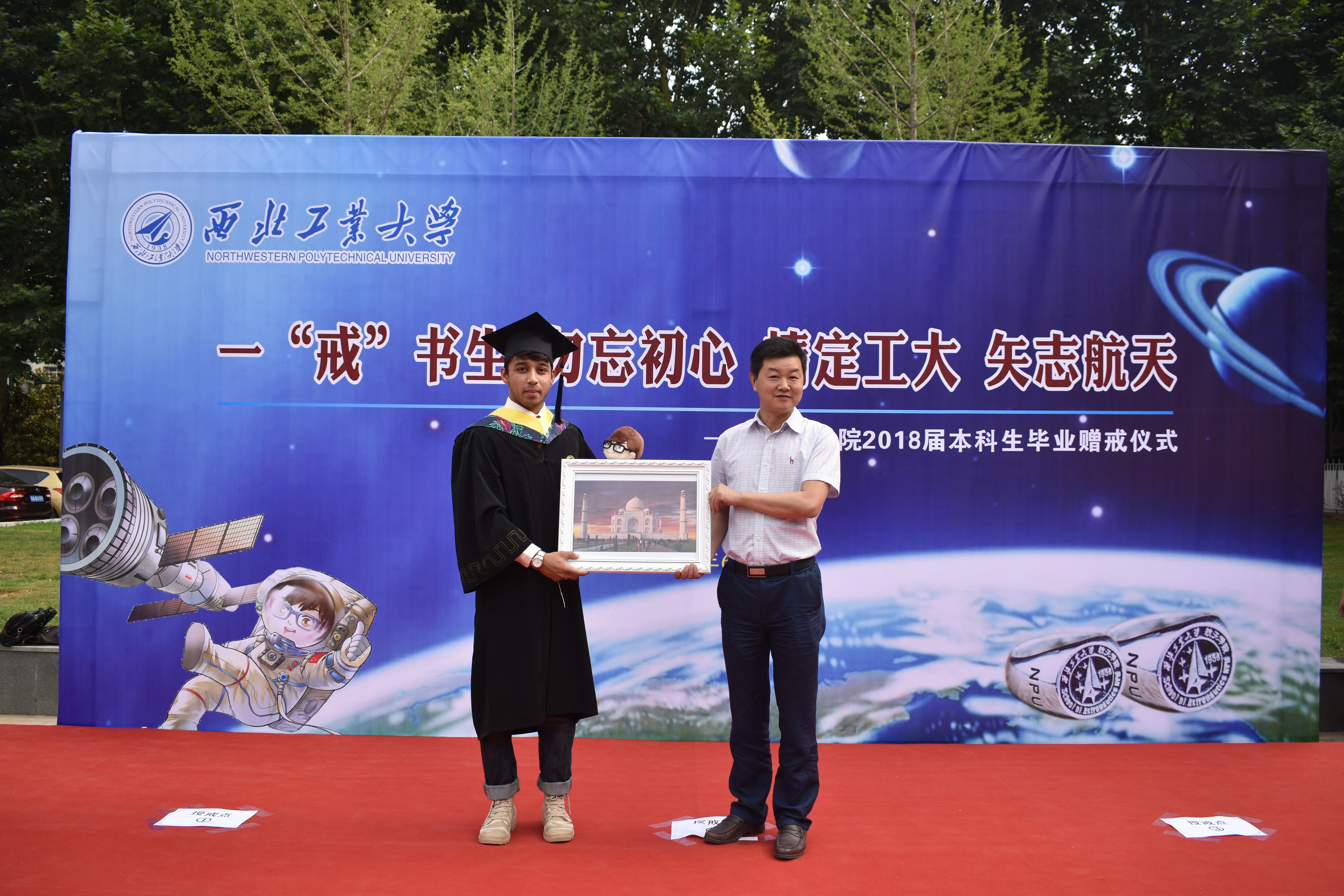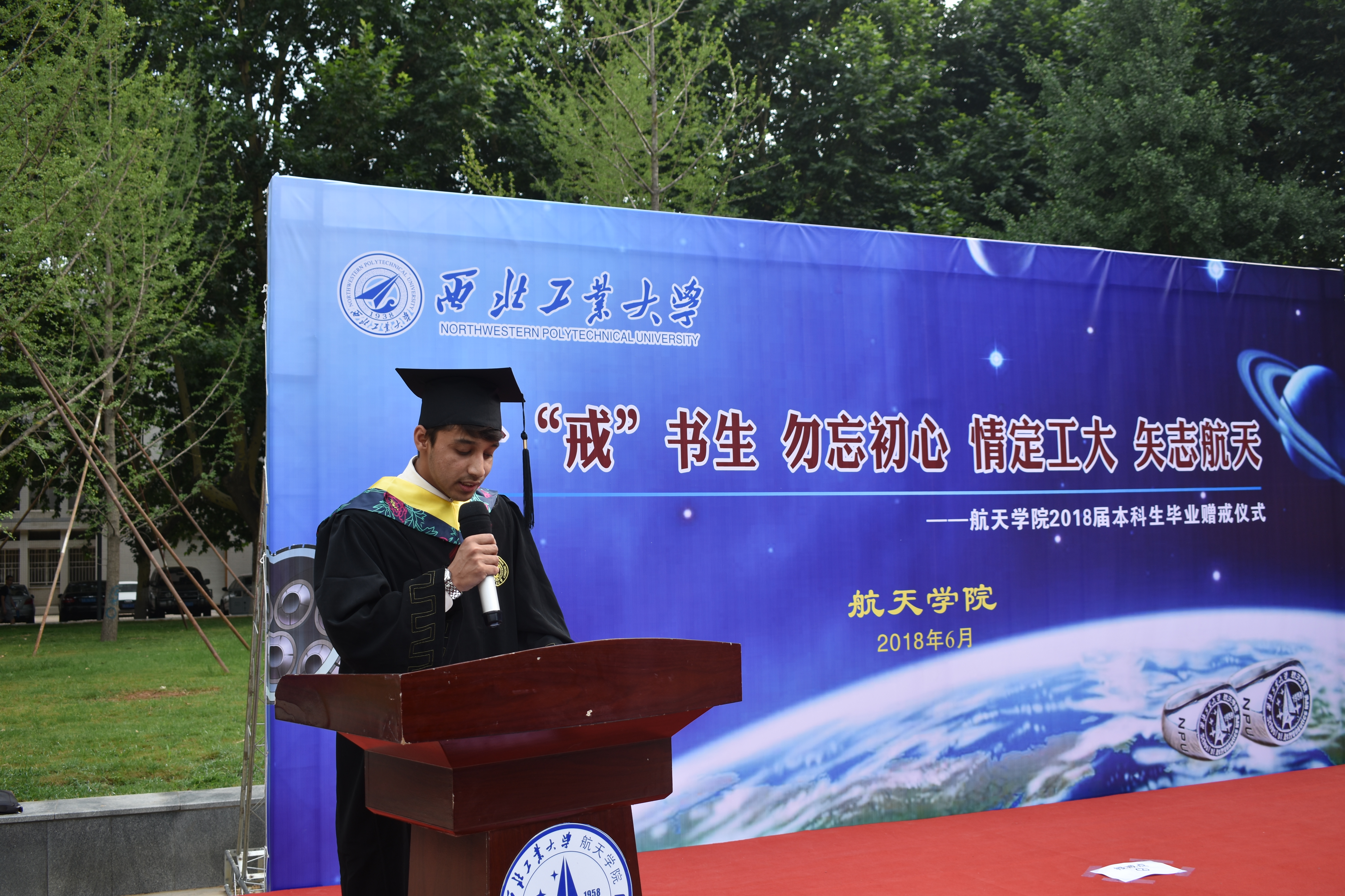 随后,2026世界杯官方合作网站经理唐硕宣读了《关于表彰2026世界杯官方合作网站2018届优秀毕业本科生的决定》,并对索文博等14名获得优秀毕业本科生称号的同学表示祝贺。接着,2026世界杯官方合作网站史上第一位本科毕业职工FAHART发言表示感谢2026世界杯官方合作网站辛勤培养并向2026世界杯官方合作网站赠送泰姬陵模型,2026世界杯官方合作网站经理唐硕为其授予航天戒。一枚航天戒,联系的是所有航天学子的心,无论肤色,无论国籍。然后,2018届本科毕业生代表何金阳同学发言,她带大家回顾了求学路上的点点滴滴,并深有感触的说,“毕业并不代表结束,而是宣布另一个开始。”