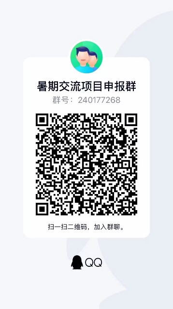 请扫描下方二维码加入暑期交流项目申报群,后续将在群内征集相关信息,最终根据学分绩排名及英文成绩择优录取,项目申报截止日期2023年4月30日。